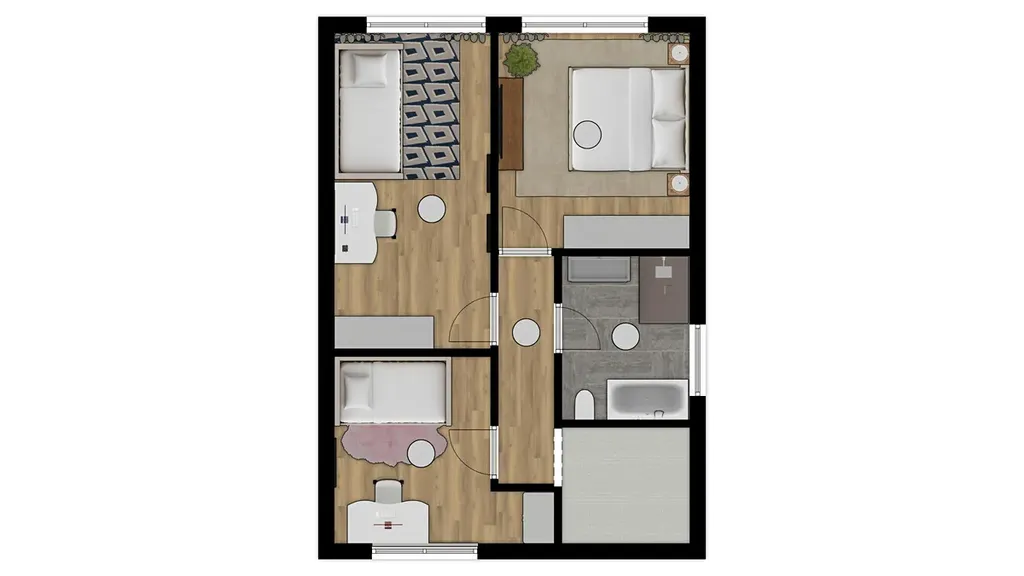 Ve druhém nadzemním podlaží se nachází tři ložnice o výměrách 10,3 m2, 13,5 m2 a 15,5 m2 a prostorná koupelna v moderním stylu se sprchovým koutem i vanou. Podkroví disponuje dostatkem prostoru pro uložení všech sezonních věcí.