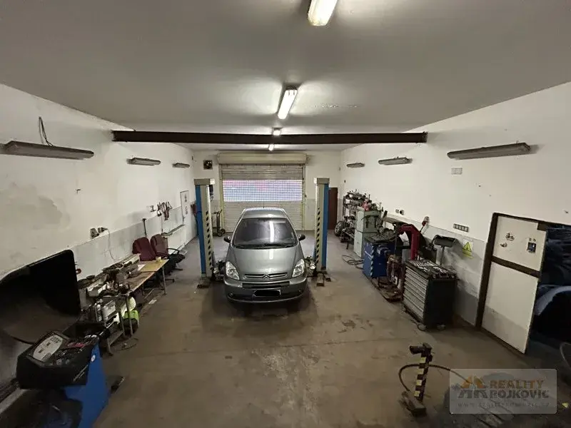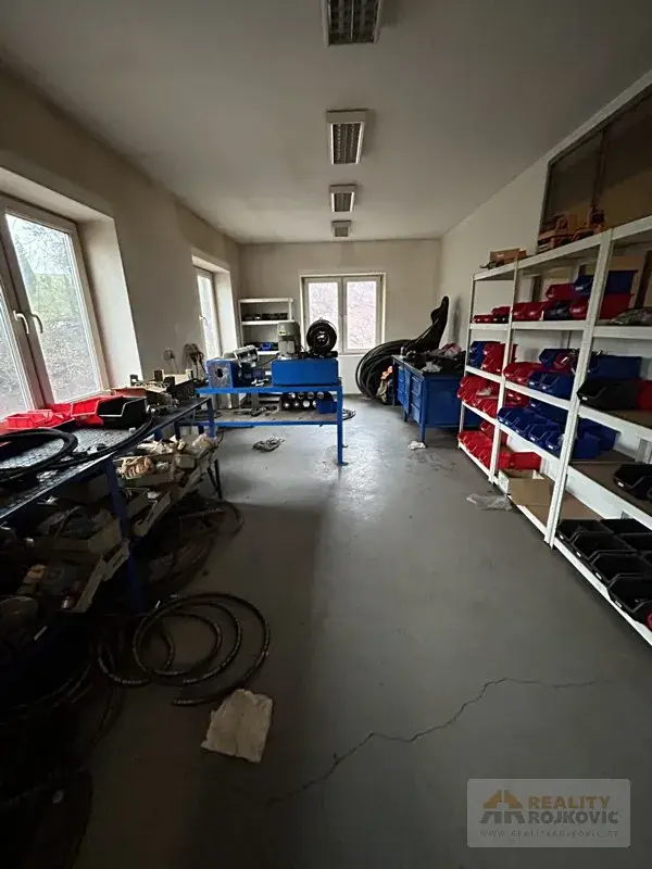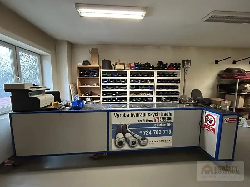Prodej komerčního objektu s velmi širokým využitím v obci Jetřichov na Broumovsku. Areál je v současné době užíván jako zázemí firmy se servisní halou s mostovým jeřábem, skladovací a montážní halou, pneuservisem, garážemi, kancelářemi, denní místností, šatnou, WC a umývárnou pro zaměstnance. Hlavní částí je již zmíněná servisní hala s nástrojárnou o ploše 250 m², kde se provádí servis a údržba vozového a strojového parku firmy. Další využívaný prostor je v II NP, kde jsou kanceláře se zázemím pro personál, sklad náhradních dílů apod. Samostatným úsekem je pneuservis a skladovací hala s podlahovou plochou až 400 m². Vytápění nemovitosti je zajištěno kotlem na TP a ohřev vody kombinovaným bojlerem. Součástí areálu je dostatečný manipulační prostor pro parkování a obsluhu firemní techniky. Bližší informace Vám podáme v realitní kanceláři.