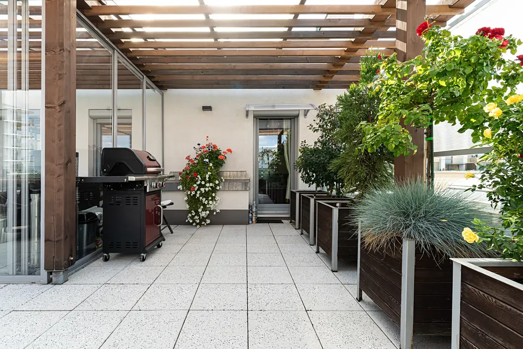 Francouzská okna v obývacím i dětském pokoji umožňují vlastní vstup na prostornou terasu, která je částečně zastřešená, což zajišťuje její pohodlné využívání i za nepříznivého počasí. Součástí terasy je nově vybudovaná zimní zahrada o rozměrech 2,8 × 6,6 metru.