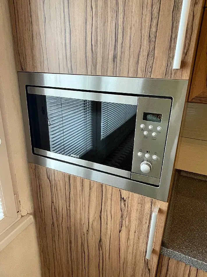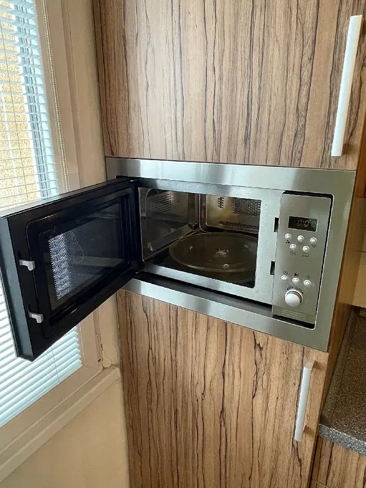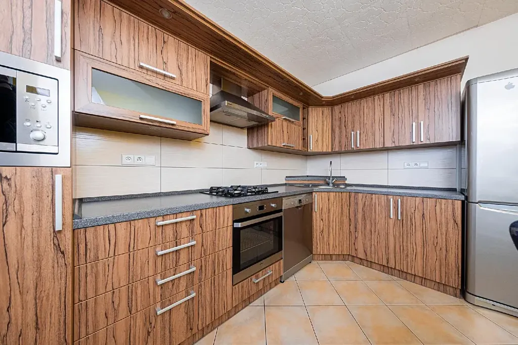 Kuchyně je vybavena nadčasovou kuchyňskou linkou ve tvaru "L", je zde vestavěná elektrická trouba BEKO, plynová varná deska BOSCH, volně stojící lednice s mrazákem INDESIT, vestavěná mikrovlnná trouba BEKO a digestoř BEKO. Vše je bez poškození ve výborném stavu, plně funkční. Součástí vybavení je i skleněný jídelní stůl a 4 židle.