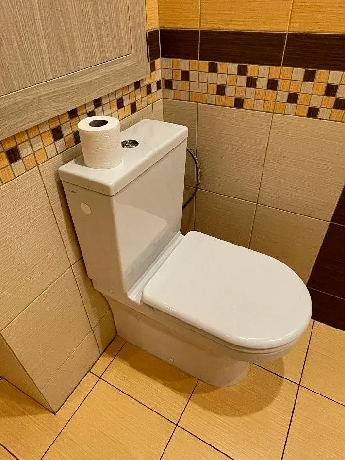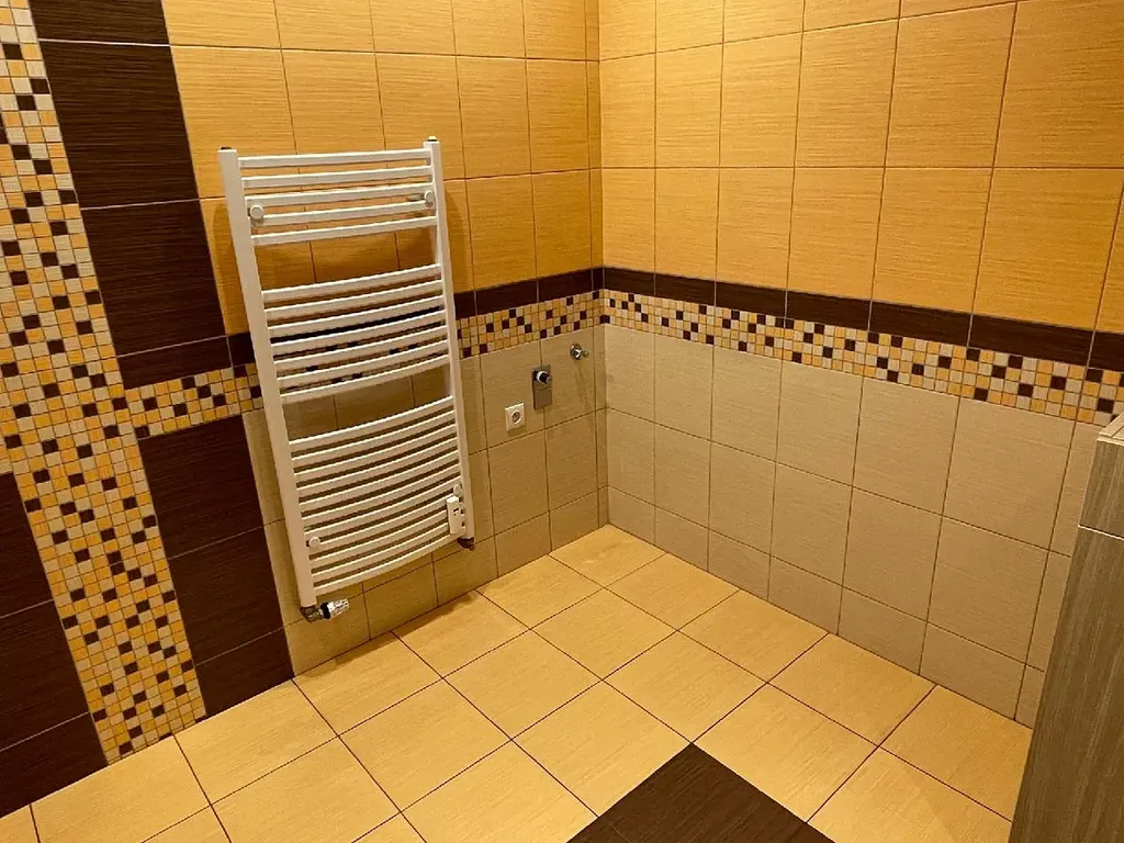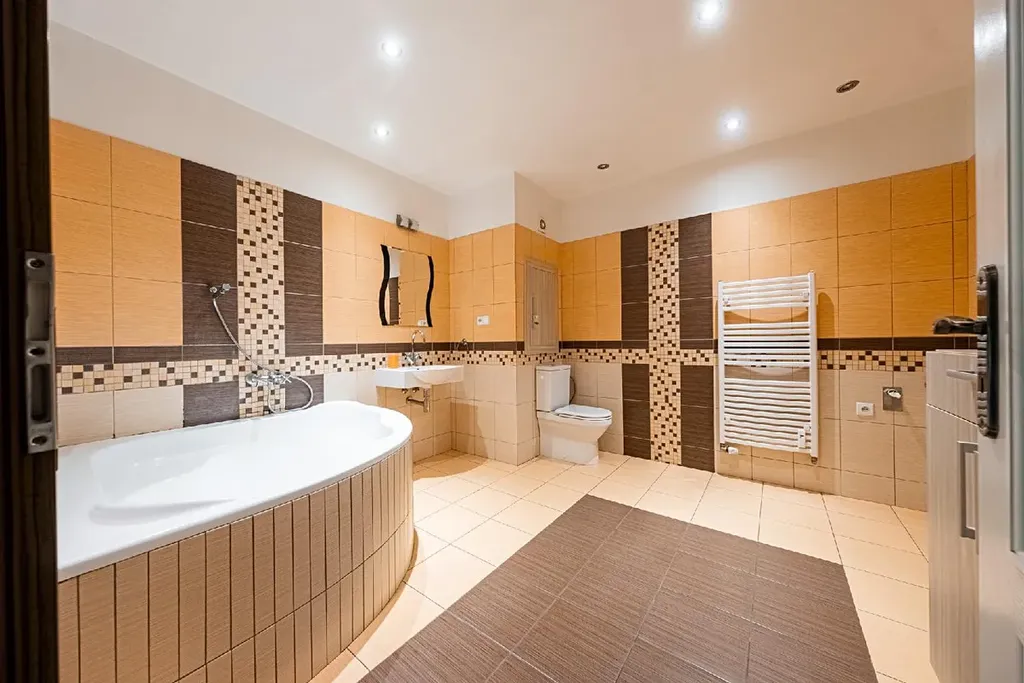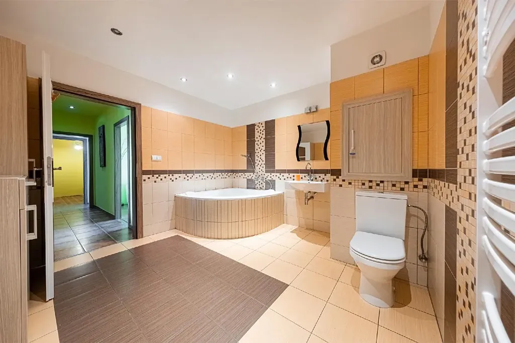 Velikostně opravdu nadstandartní koupelna disponuje rohovou vanou, umyvadlem se zrcadlem, WC, topným žebříkem, komodou, prostorem a připojením pro pračku a sušičku.