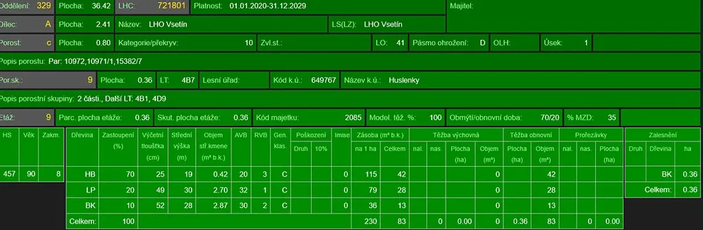 - p.č. 10972 vedená jako lesní pozemek o celkové výměře 1 601 m2 (stáří lesa 96 let - zastoupení dřevin habr, lípa, buk, stáří lesa 46 let - zastoupení dřevin lípa, habr, javor, smrk),
