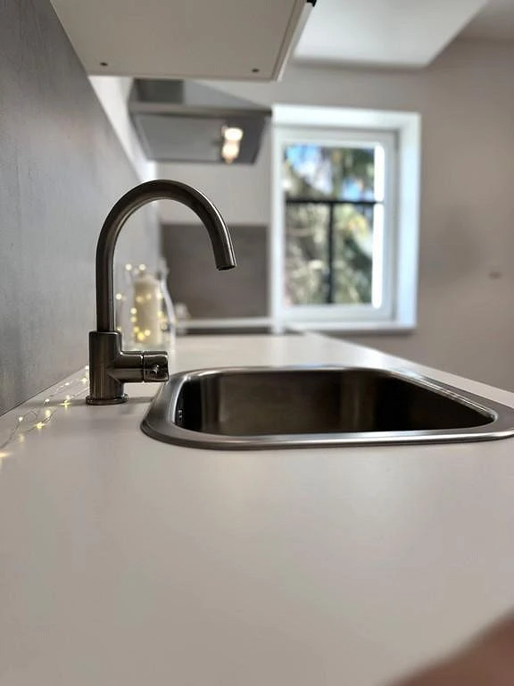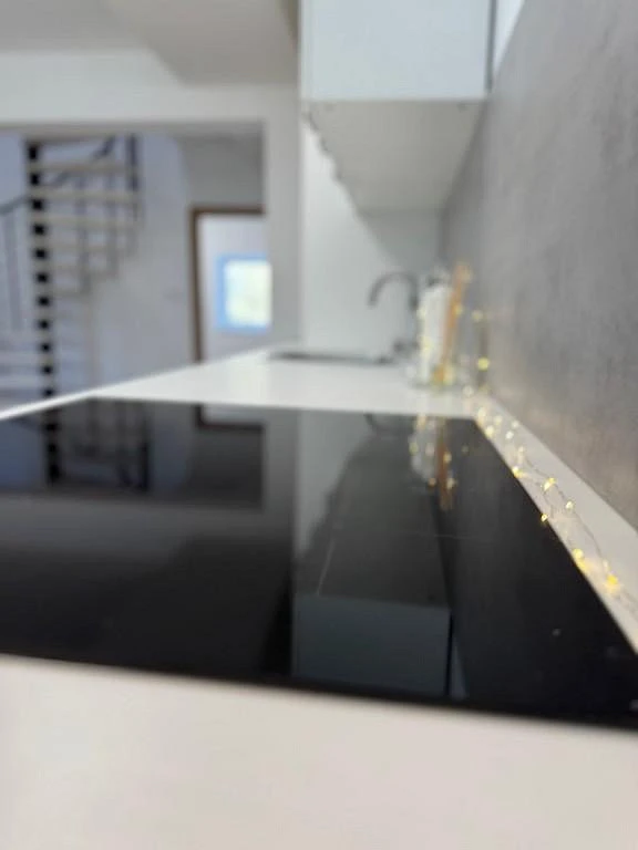 Dominantou bytu je vzdušný obytný prostor s kuchyňským koutem, který přirozeně propojuje zónu vaření, stolování i odpočinku. Elegantní kuchyňská linka na míru je vybavena moderními spotřebiči a splní očekávání i náročnějších uživatelů.