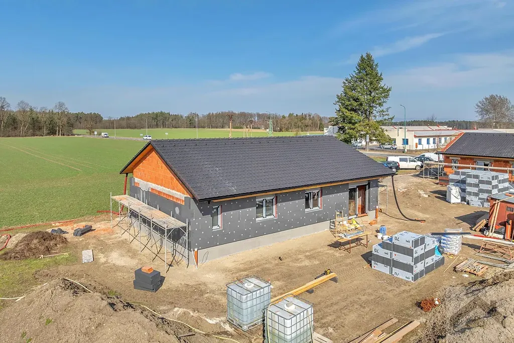 K prodeji je novostavba jednopodlažního rodinného domu ve and #34;městě mezi lesy and #34; - v Horním Jelení. Dům je situován na rovinatém pozemku o výměře 864 m2, v okrajové nově vznikající rezidenční čtvrti, severně od centrální části obce. Rodinný dům je půdorysného tvaru obdélníku s rozměry 14,66 m x 9,11 m. Výška objektu od úrovně 1. NP k hřebenu střechy je 5,5 m. Dům nabízí zastavěnou plochu 133,6 m2, užitnou plochu 104,6 m2 a je dispozičně řešený jako 4+kk. Skrze zádveří je vstup do chodby a následně do obývacího pokoje s kuchyní a jídelnou. Ze vstupní chodby je dále přístupná ložnice s šatnou, pokoj, pracovna, koupelna, technická místnost a WC. Z kuchyně je vstup do spíže. Pozemek bude oplocen. Dům bude předán zkolaudovaný, jeho dokončení je plánováno na červenec 2026. Okna a dveře na terasu jsou plastová s izolačním trojsklem. Střešní krytina je z keramických tašek Tondach. V obytných místnostech budou použity lepené vinylové dílce, v místnostech hygienického zázemí a technické místnosti keramická dlažba. Vnitřní dveře budou dřevěné plné s CPL povrchem osazené do dřevěných obložkových zárubní. Koupelna bude osazena sanitární technikou. Součástí domu při předání nebude kuchyňská linka. Dům je napojen na veřejný vodovod, kanalizaci a elektřinu. Vytápění domu zajistí tepelné čerpadlo vzduch-voda s podlahovým vytápěním. Pozemek je příjemně orientován, v zástavbě nízkopodlažních rodinných domů, s lesem za zády a v obci s dobrou úrovní občanské vybavenosti. Z Horního Jelení jsou skvěle dostupné Holice, Vysoké Mýto, Borohrádek a Choceň. Do 30 min. jste v Hradci Králové. Svou polohou uprostřed lesů láká ke sportu i k procházkám k blízkým rybníkům. Okolní lesy nabízí každoroční bohatou úrodu hub a borůvek.