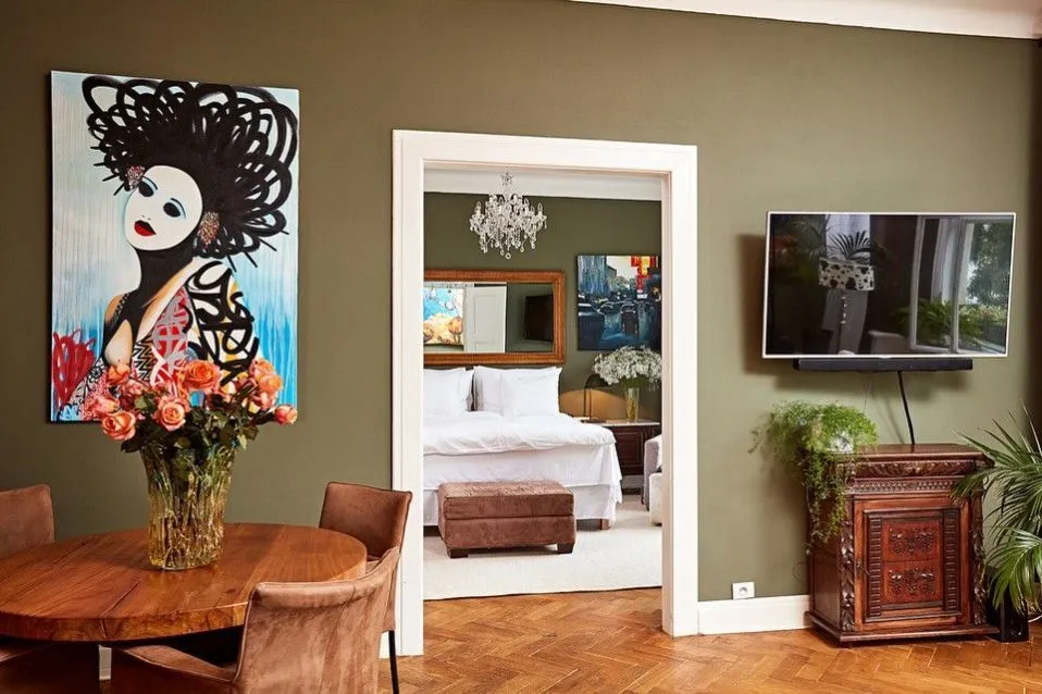 Nadstandartní vybavení a provedení, vysoké stropy, prosvětlené pokoje, vysoké stropy, velká okna, parkety, mramorové obložení v koupelně a kuchyni, centrální vytápění, stmívače světel, pračka se sušičkou, myčka, základní nádobí a kuch. náčiní, TV, inteligentní ovládání domácnosti, videotelefon, sklepní kóje. Byt lze pronajmout jako zařízený nebo nezařízený.