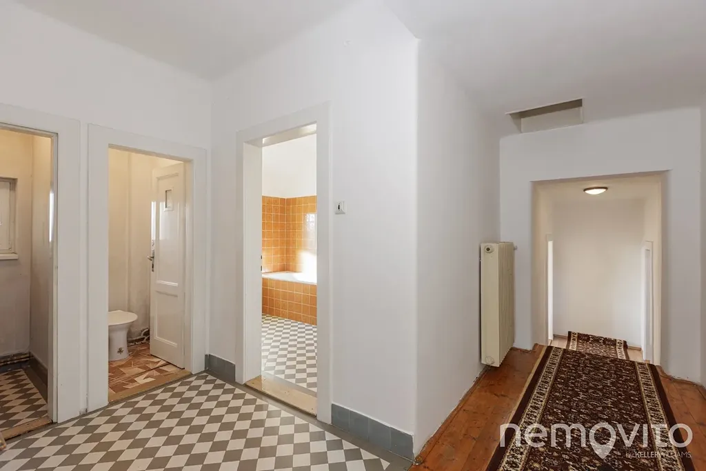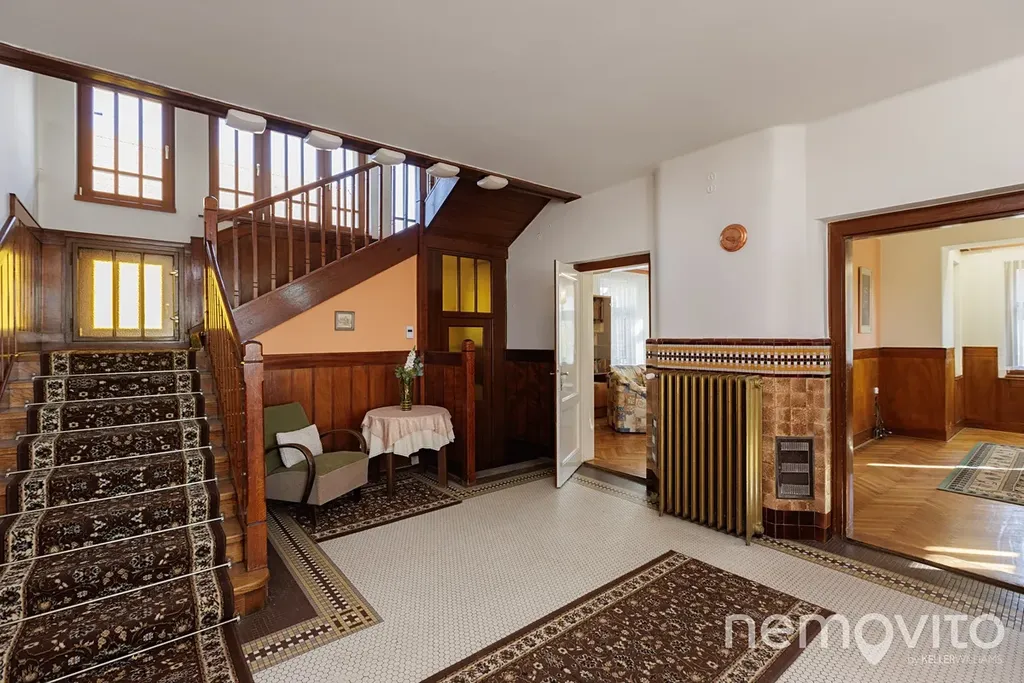 Dominantu stavby tvoří téměř 40 metrová vstupní hala se schodištěm, do které je možné opět umístit kamna. Původní dřevěné schodiště, obložení stěn i mozaiková podlaha jsou skutečnou pastvou pro oči každého fanouška starých domů. Přestože má téměř 90 let, dispozice je řešena velmi prakticky. Na každém podlaží je sociální zázemí a pokoje jsou prostorné. Ložnice jsou navíc orientované směrem do zahrady, tedy na západní stranu.