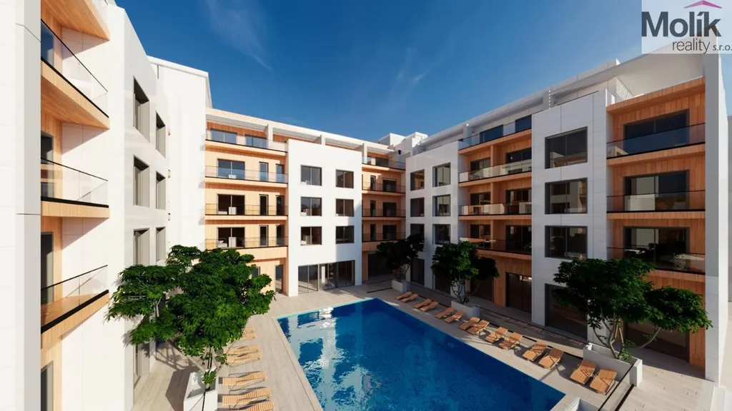 Apartmán je situován v budově s uzavřeným vnitroblokem, což zajišťuje obyvatelům maximální soukromí a klid. Dominantou celého komplexu je velkorysý venkovní bazén, kolem kterého se soustředí veškerý společenský život.