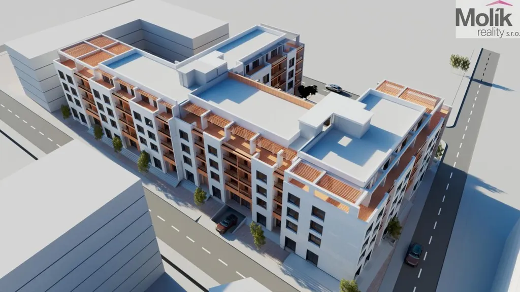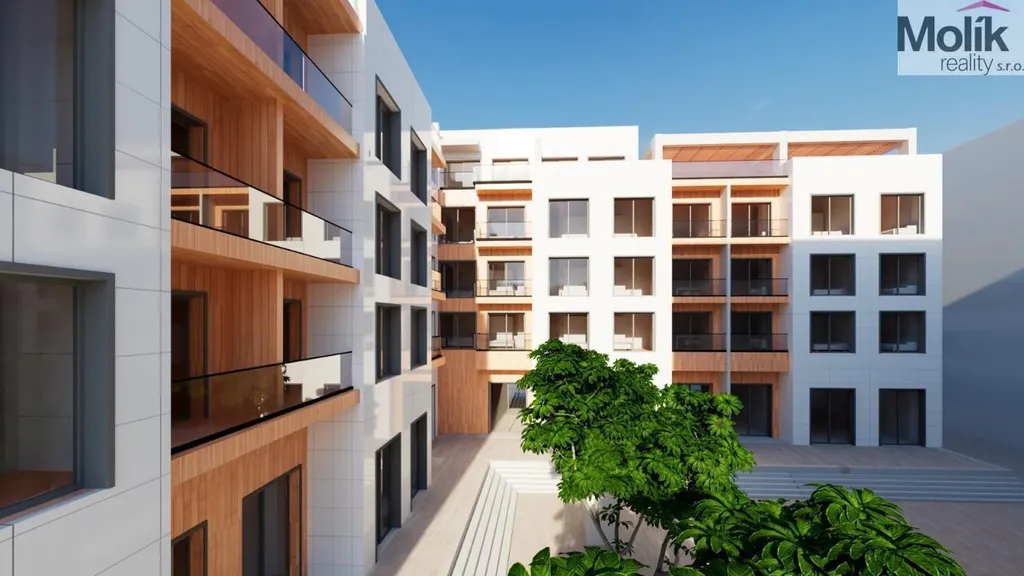 Design a kvalita: Fasáda kombinuje moderní hliníkové prvky, skleněná zábradlí na balkonech a dřevěné obklady, které dodávají stavbě luxusní vzhled.