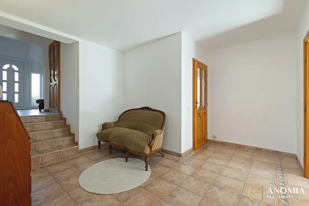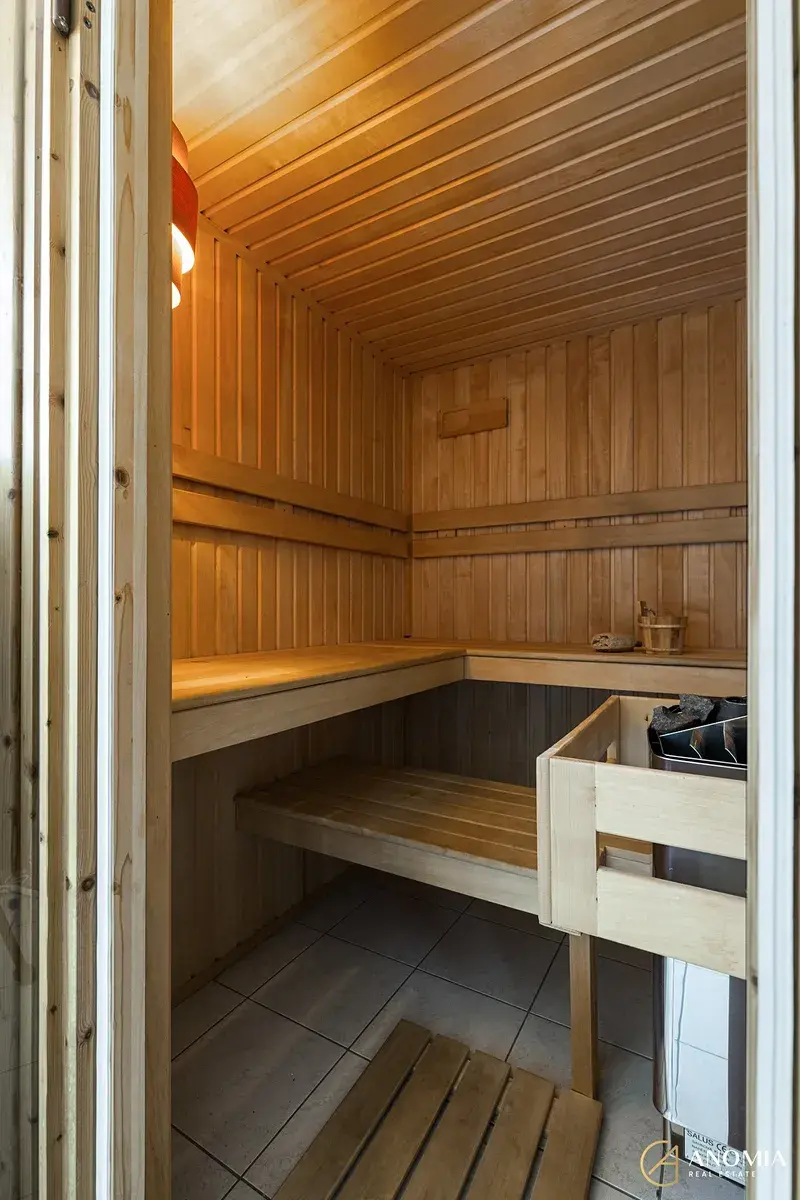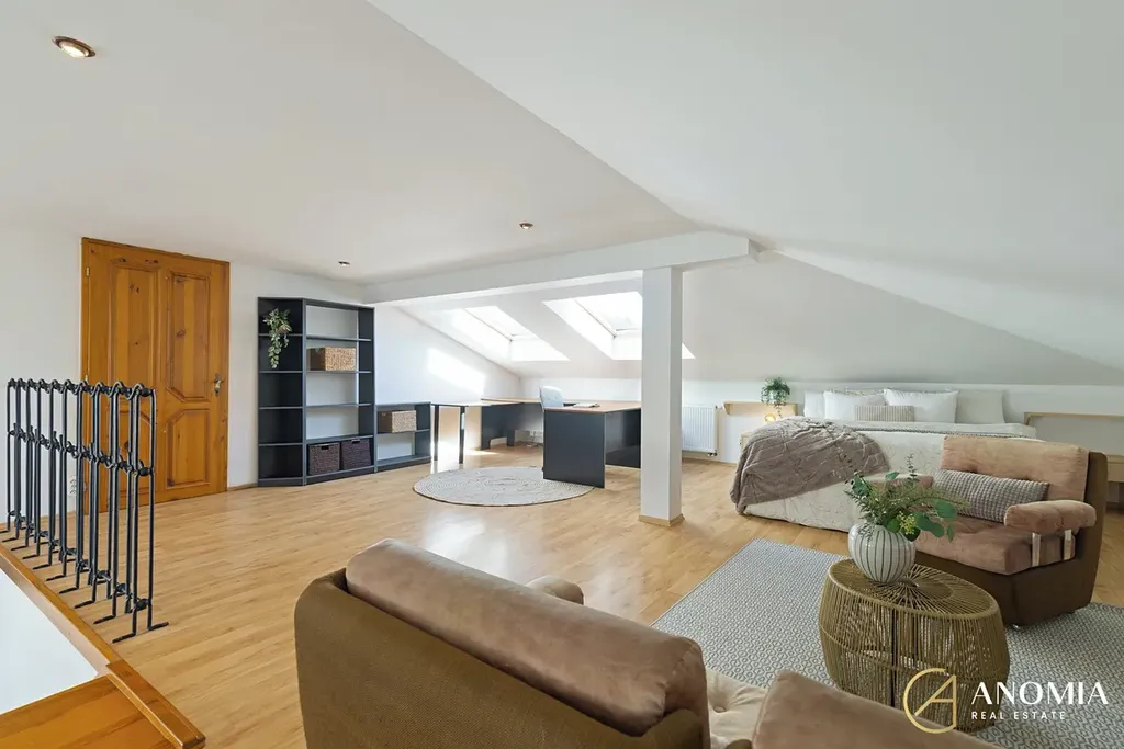 Z obývací části vede schodiště do horního patra, které může sloužit například jako ložnice, pracovna nebo pokoj pro hosty a je propojeno s galerií otevřenou do obytného prostoru. K dispozici jsou také další dva samostatné pokoje. Součástí domu je koupelna s finskou saunou a nechybí ani relaxační místnost s vířivkou, odkud se díky velkým francouzským oknům otevírá příjemný výhled do zahrady. Praktickým zázemím domu je také technická místnost v přízemí a půdní prostor v patře, který nabízí další úložné možnosti.