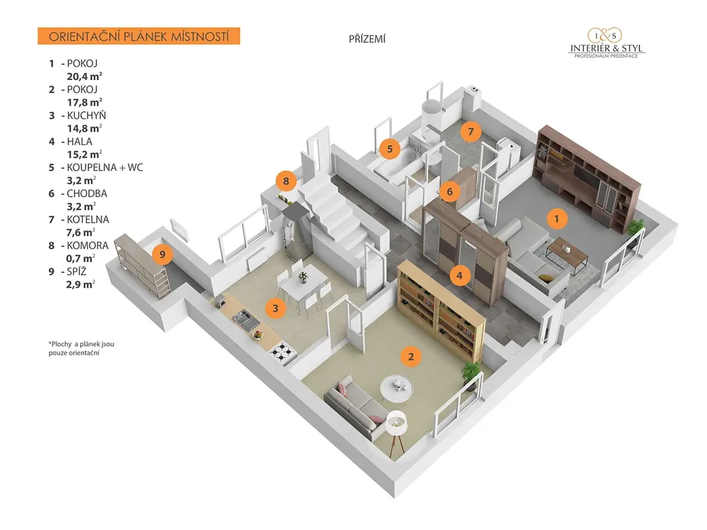 Přízemí (byt 3+1): Prostorné pokoje, kuchyně, koupelna s WC a praktické zázemí včetně spíže a kotelny 82 m²