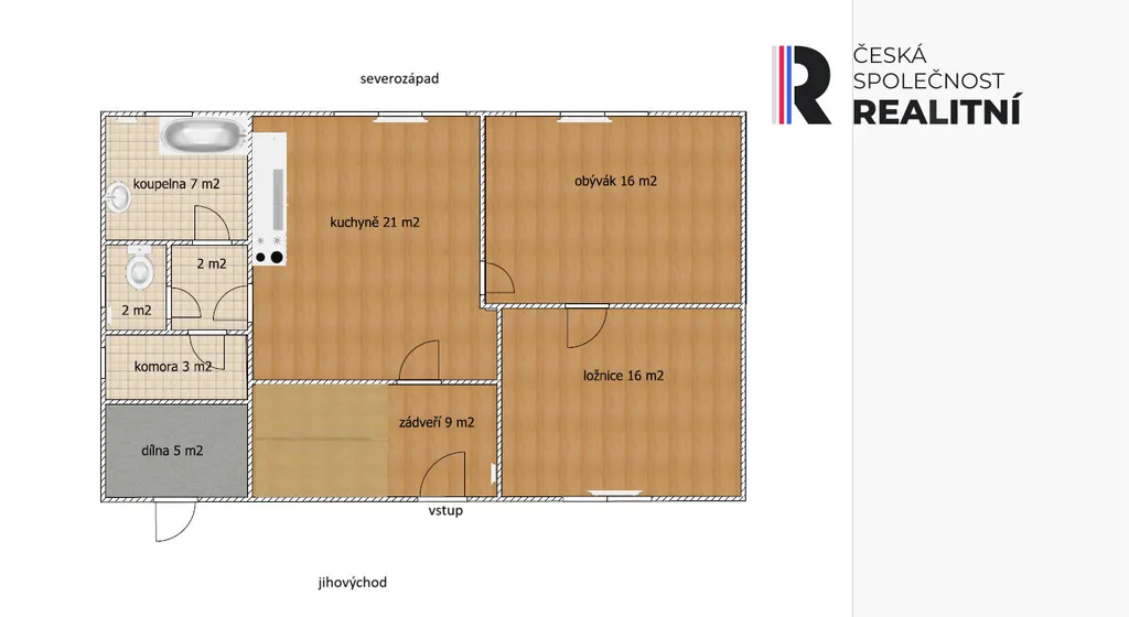 V přízemí se nachází zádveří, kuchyně, dvě místnosti, koupelna s vanou, samostatné WC a komora. V podkroví dvě místnosti a terasa.