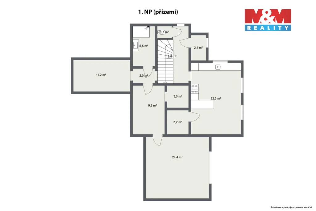 První patro nabízí dvě prostorné obytné místnosti a samostatné WC.