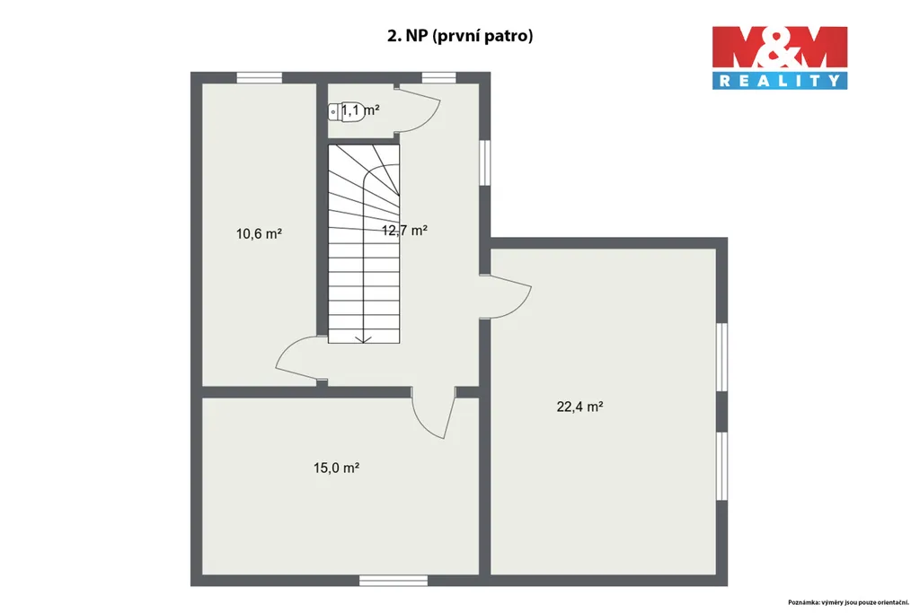 Ve druhém patře se nacházejí další dvě obytné místnosti, mohou sloužit jako ložnice, dětské pokoje, pracovna nebo pokoj pro hosty.
