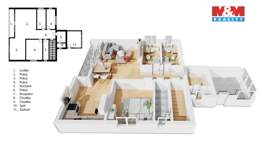 Obytná část nabízí plochu o velikosti 126 m². Dominantou je prostorný obývací pokoj spojený s prakticky řešenou kuchyní a přímým vstupem na balkon.