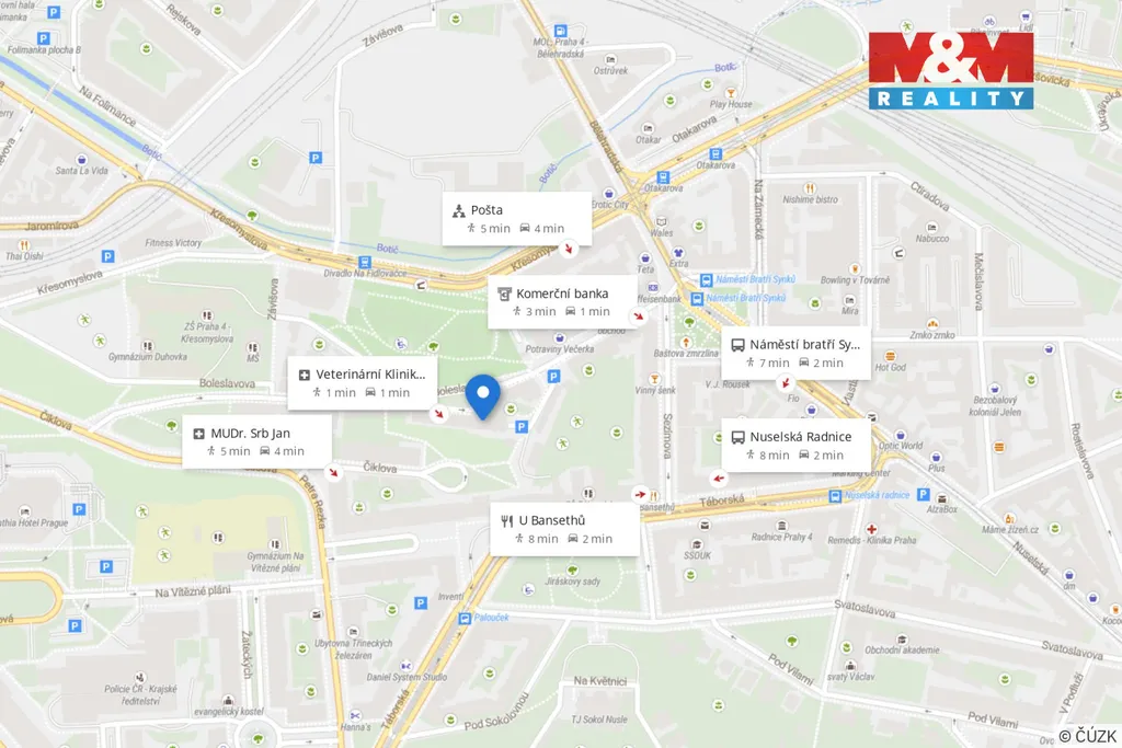 Lokalita nabízí výbornou dopravní dostupnost – metro C Vyšehrad cca 8 minut pěšky, tramvaj 4 minuty, centrum do 10 minut. Do budoucna výrazný benefit v podobě nové stanice metra D – Náměstí Bratří Synků (cca 2 minuty od domu).