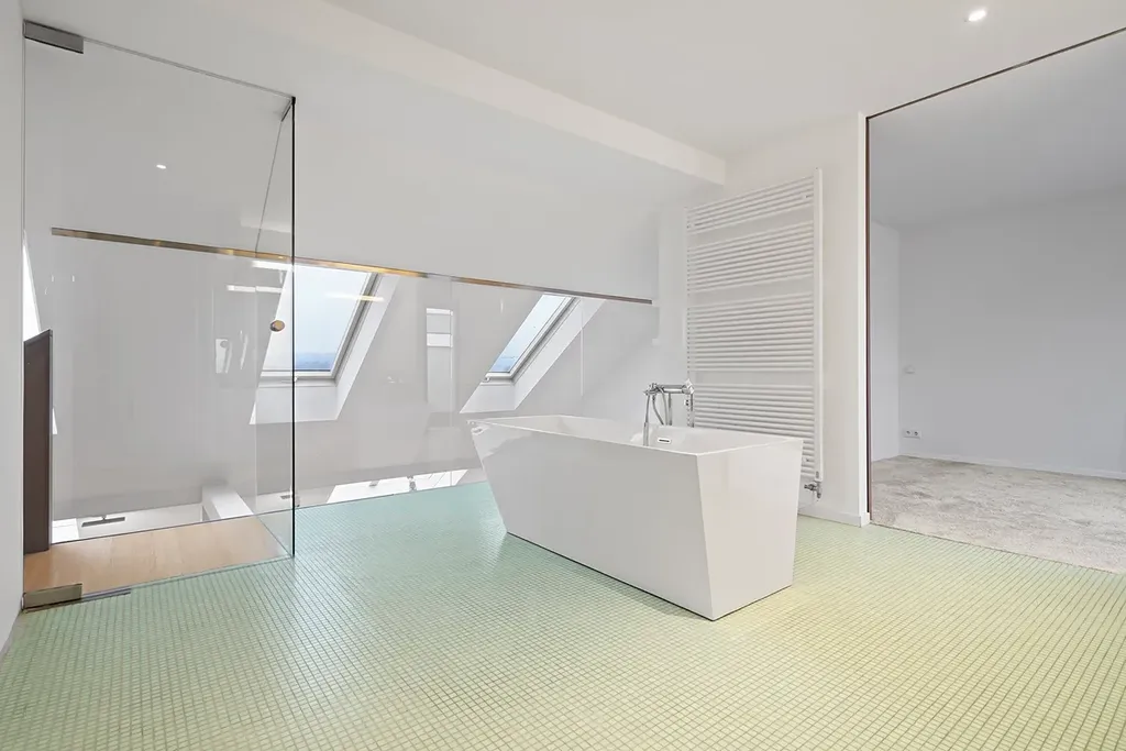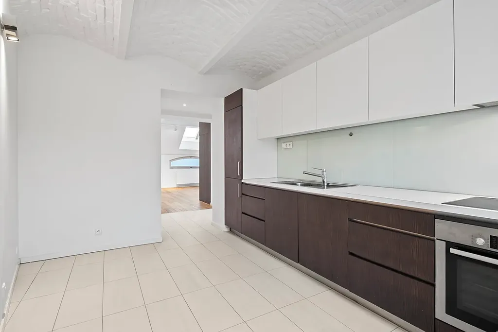 Byt je řešen jako dvoupodlažní, což přináší přirozené oddělení denní a klidové části a zároveň pocit vzdušnosti a prostoru. K dispozici je kuchyňská linka se spotřebiči, dvě koupelny se sprchovým koutem a vanou a terasa orientovaná do klidného prostředí, vhodná pro každodenní odpočinek.