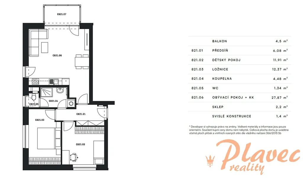 Dispozice: předsíň (6,08 m2), obývací pokoj s kuchyňským koutem (27,87 m2), balkon (4,5 m2), ložnice (12,37 m2), dětský pokoj (11,91 m2), koupelna (4,48 m2), toaleta (1,34 m2). K bytu náleží také sklep v přízemí domu a vlastní parkovací stání u domu.