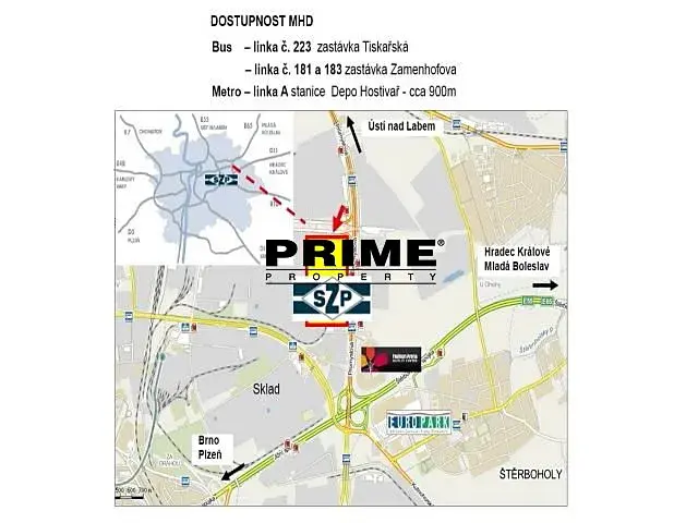 Kancelářské prostory k pronájmu, 206m2, situované v 1. patře dvoupodlažního objektu (bez výtahu) umístěného v logistickém areálu v Praze 10 v Malešicích. Areál se nachází u Průmyslové ulice a nedaleko Jižní a Štěrboholské spojky. Před areálem je zastávka autobusů se spojením (4 minuty) ke stanici metra Depo Hostivař. Přístup do areálu je z Tiskařské ulice přes novou vrátnici.