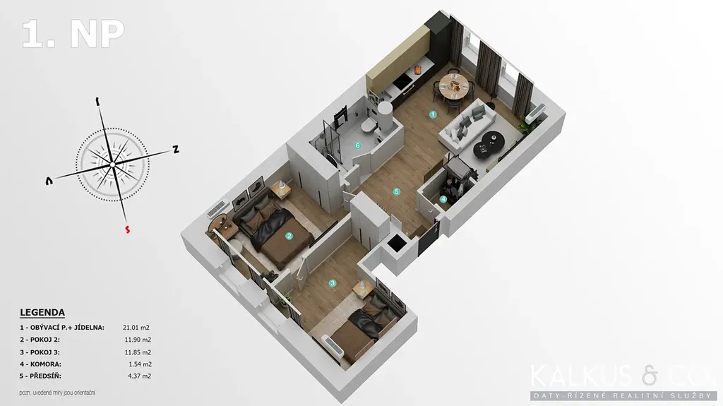 - prostorný obývací pokoj s kuchyňským koutem o velikosti cca 21 m² (kuchyňská linka není součástí, nový majitel si ji může realizovat dle vlastních představ)