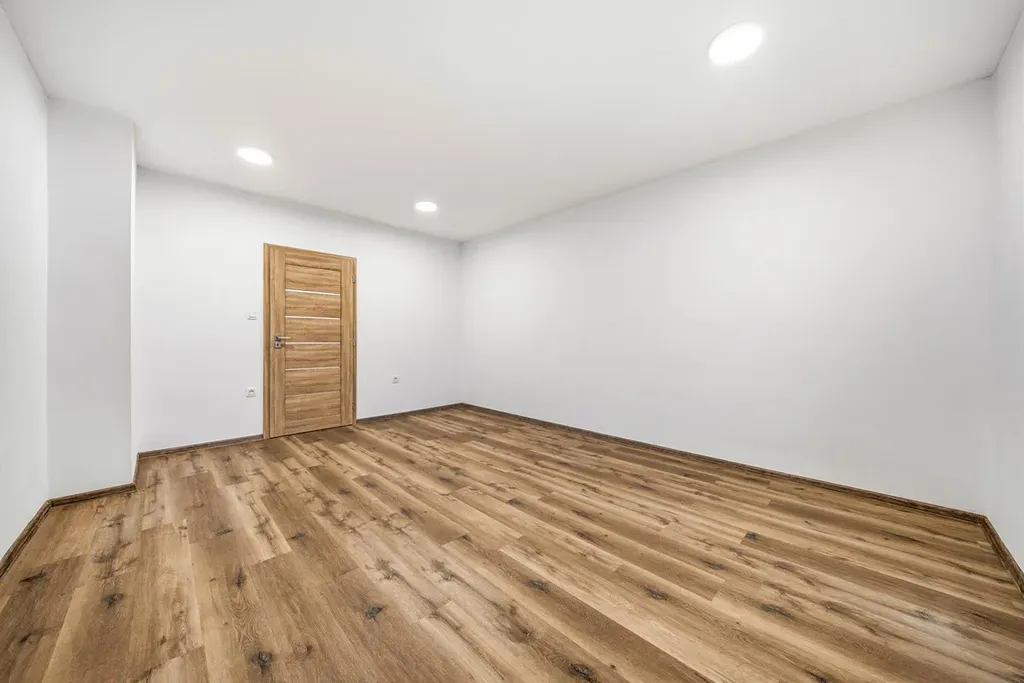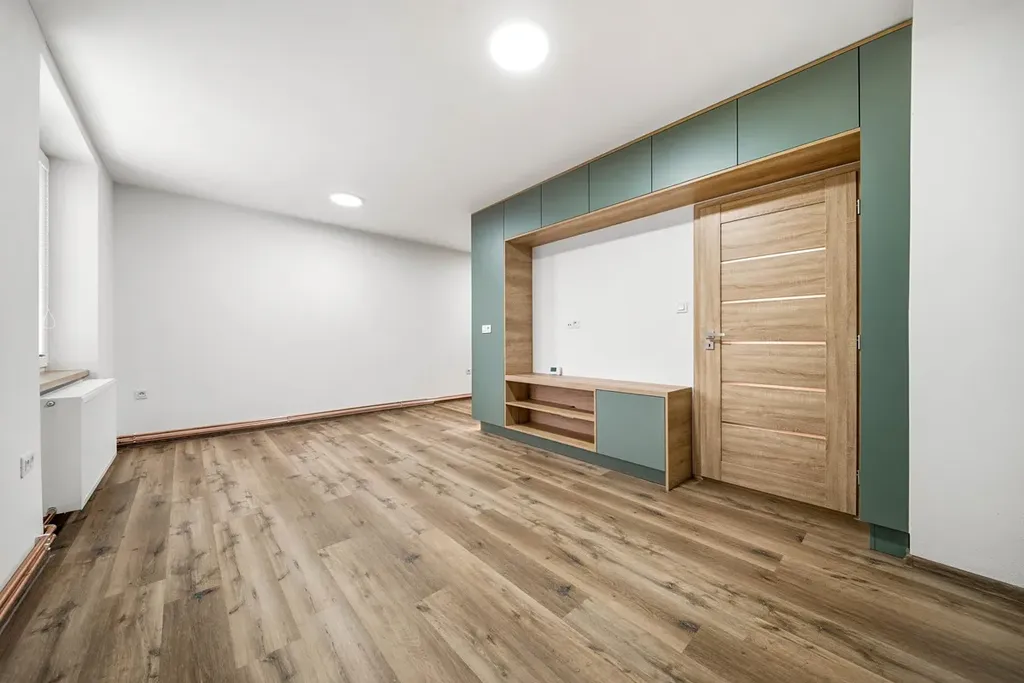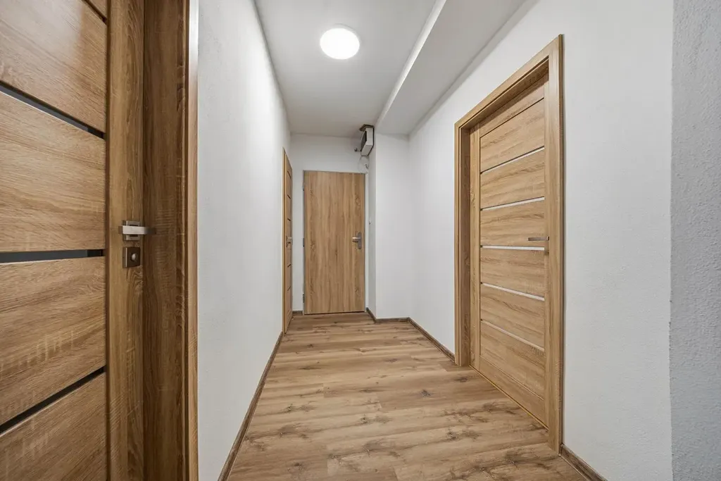 Dispozice bytu zahrnuje vstupní chodbu, koupelnu, samostatné WC, obývací pokoj s kuchyňským koutem, ložnici a dětský pokoj. Součástí bytu je také sklep. Kuchyňská linka je vybavena spotřebiči a plynule navazuje na obývací část, což vytváří příjemný a praktický prostor pro každodenní život.