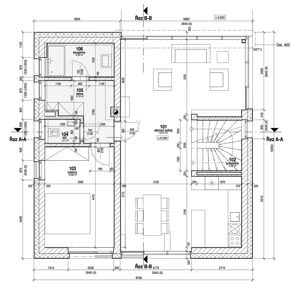 Součástí prodeje je projekt moderního rodinného domu o dispozici 5+kk s užitnou plochou 147 m² a garáží o velikosti 28 m². Návrh je koncipován jako praktické a nadčasové bydlení pro rodinu, která hledá rovnováhu mezi otevřeným společenským prostorem a dostatkem soukromí. Dispozice přirozeně pracuje se zahradou a orientací pozemku tak, aby obytná část domu těžila ze světla i výhledů do okolní zeleně. Odhadovaná cena postavení domu je kolem 8 milionů korun*.
