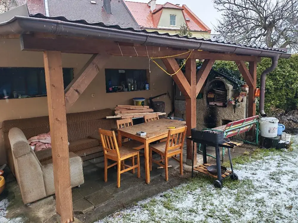 Plocha okolního pozemku = zahrady je 121 m², což je dostatečné pro relaxaci i drobné zahradnické práce. Součástí zahrady je pergola s posezením a bazén.