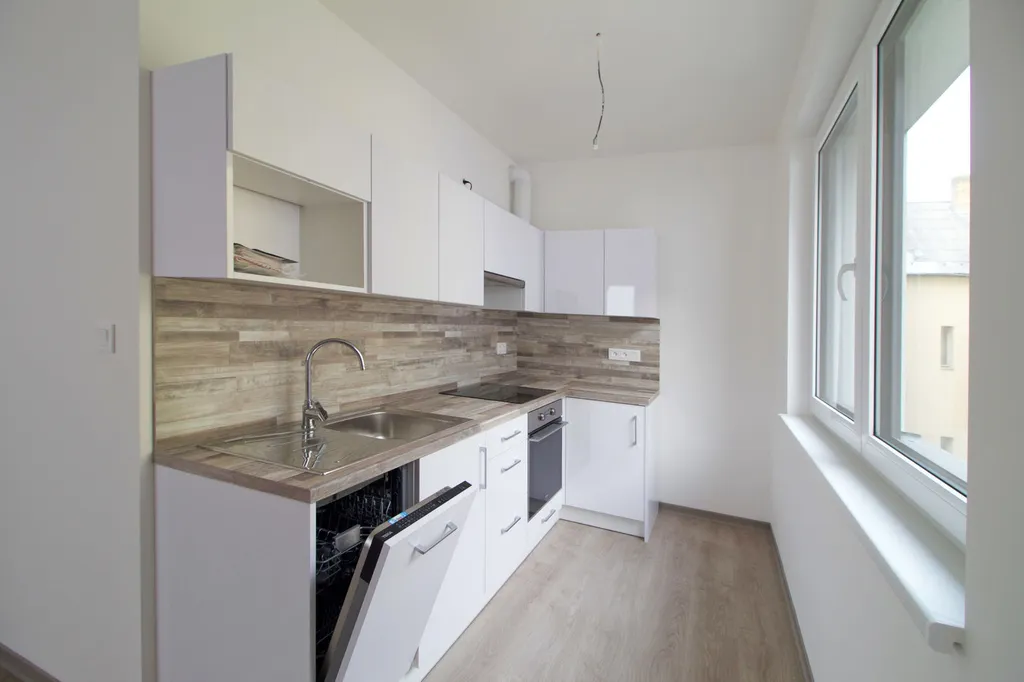Bytová jednotka je vybavená novou kuchyňskou linkou s vestavěnými spotřebiči jako myčka, elektrická trouba a elektrická varná deska. Vytápění je podlahové.