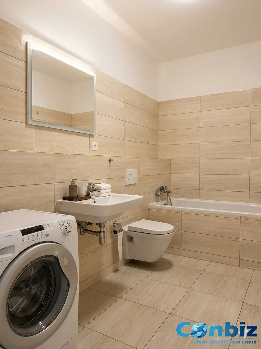Nabízíme Vám k prodeji luxusní byt 2+kk/B v novostavbě Rezidence Modřanka, pár kroků od přírody, pár zastávek od centra. Byt o velikosti 2kk 51 m2 + 13,3 m2 balkon + sklep + garážové stání. Byt se nachází v 4. patře a je vybaven gaučem, velkou postelí, skříní, kuchyňskou linkou se sklokeramickou varnou deskou, elektrickou troubou a myčkou, lednicí, koupelnou s vanou, umyvadlem, toaletou. Z obou pokojů je vstup na balkon s krásným výhledem na řeku Vltavu. Na podlahách je dřevěná podlaha, v předsíni a koupelně je keramická dlažba. Garážové stání a sklep je k ceně bytu ve výši 850.000 Kč. Celková kupní cena je tedy 9.350.000 Kč. U domu je dětské hřiště, klidné posezení ve vnitrobloku. Přímo před rezidencí je autobusová zastávka Cukrovar Modřany, 5 min. dochozí vzdálenosti tramvaj a vlak. Ve vzdálenosti 10 min. autem obchodní centrum Novodvorská Plaza.