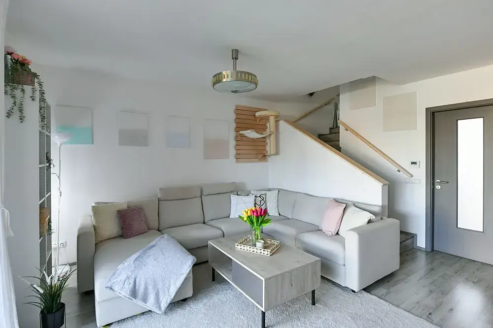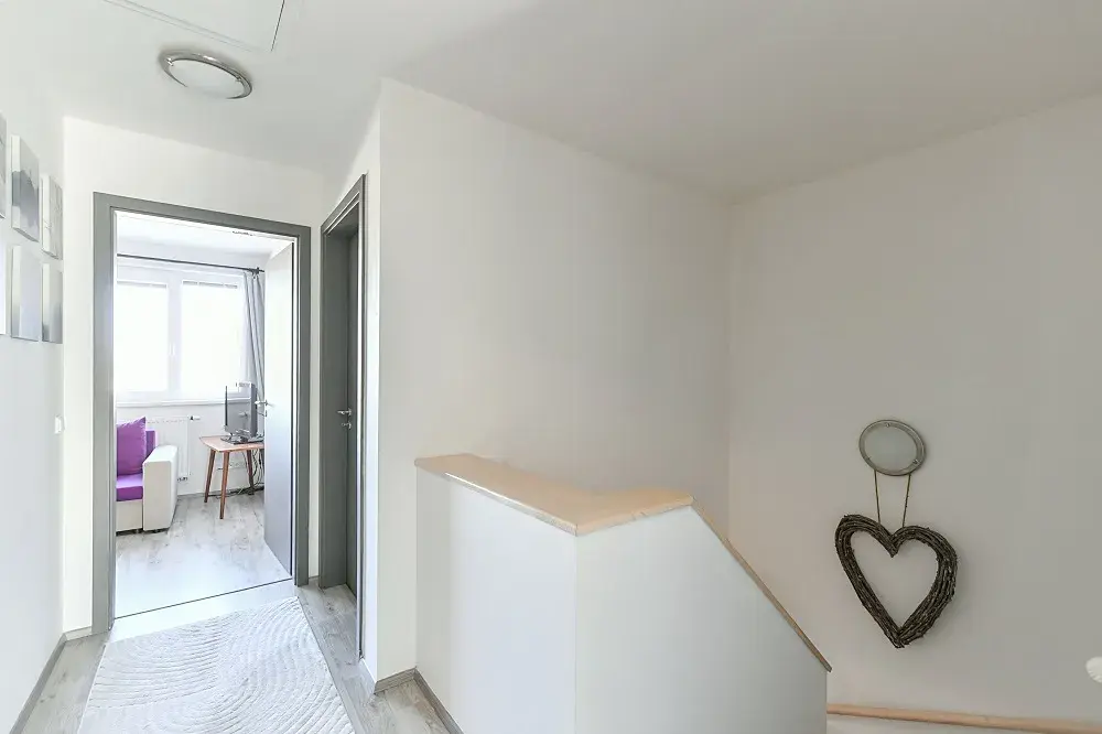 Světlý a útulný interiér nemovitosti je vybaven stylovou plně vybavenou kuchyňskou linkou, vkusně kombinovanými barvami dlažeb, obkladů a nášlapných ploch a samozřejmostí jsou kvalitní zařizovací prvky a spotřebiče v kuchyni a koupelně. Teplá voda a topení je zajištěno plynovým kondenzačním kotlem Vaillant a nechybí ani rychlé připojení k internetu díky optickému vláknu.