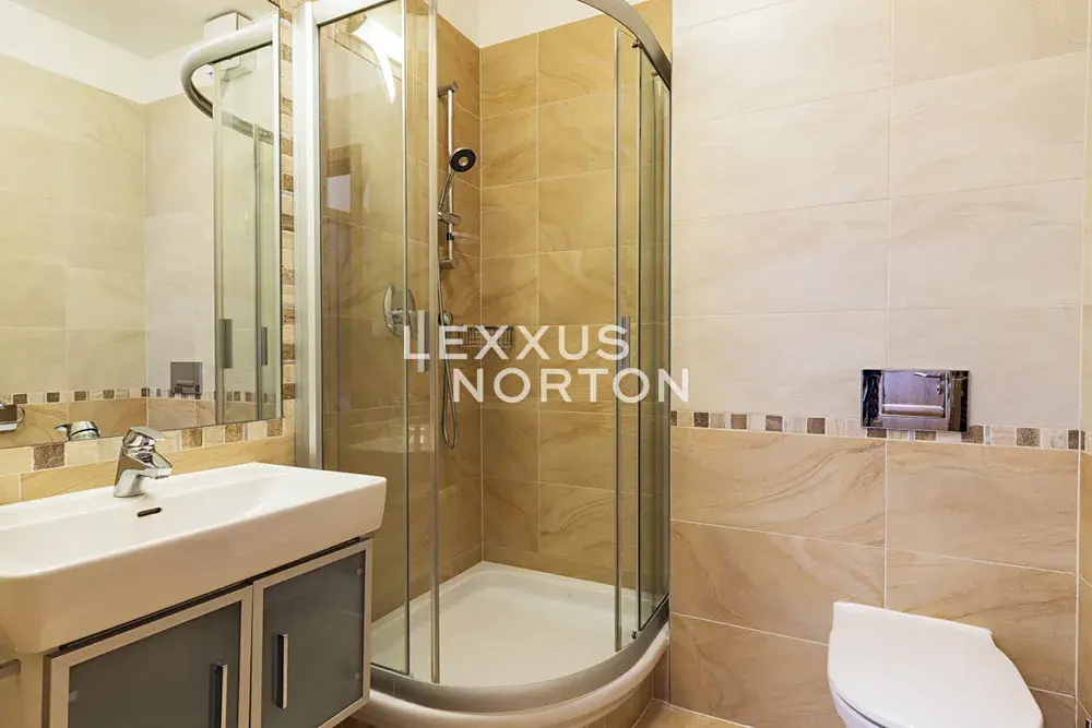 Tento rodinný dům nabízí k užívání vstupní chodbu, obývací pokoj s krbem, vstupem na terasu a zahradu (212 m2), kuchyňský kout, 4 ložnice, 3 koupelny, samostatnou toaletu a šatnu. K dispozici je balkon, druhá terasa, vinárna s krbem vhodná jako společenská místnost, posilovna se saunou a sprchou, 2 komory a technická místnost. Parkovat je možné ve dvojgaráži.