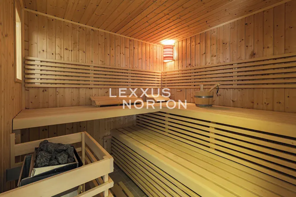 Kuchyňský kout je vybavený plynovým vařičem, troubou, lednicí, mrazákem, myčkou nádobí a mikrovlnnou troubou. Všechny místnosti jsou vybaveny vestavěnými skříněmi. Zahrada disponuje automatickým zavlažováním.