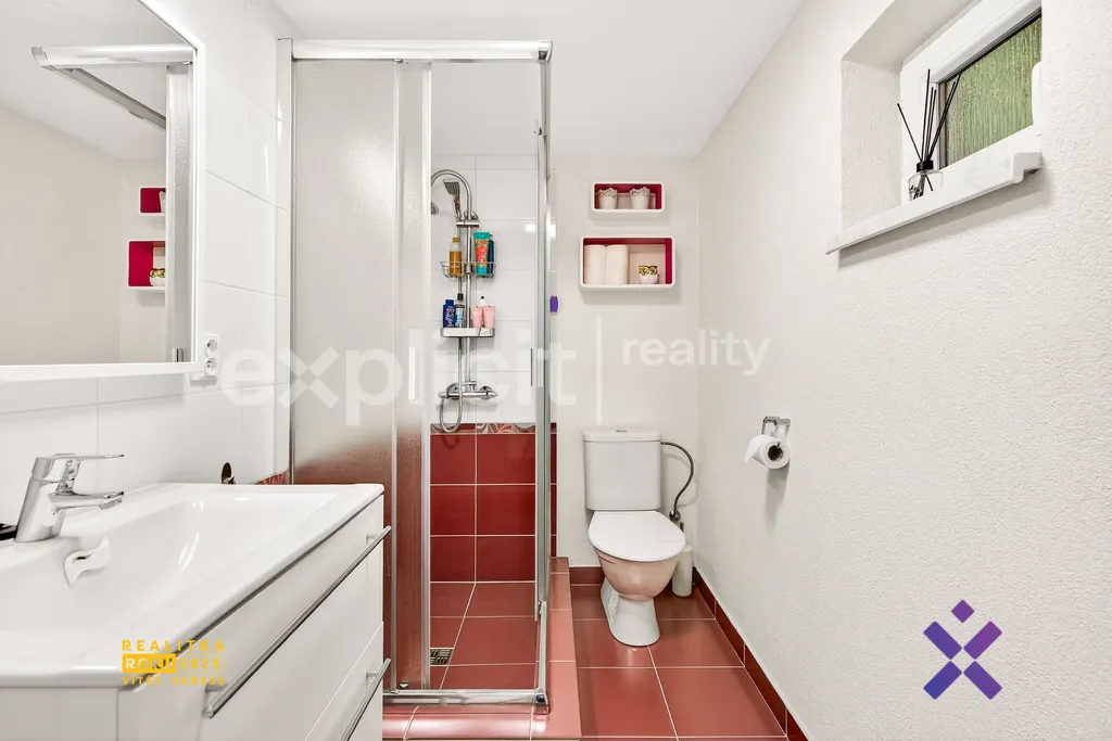 Po levé straně se nachází pokoj, který je ideální jako ložnice nebo dětský pokoj. Vedle tohoto pokoje je koupelna, která je vybavena sprchovým koutem, topným žebříkem a součástí je také WC.