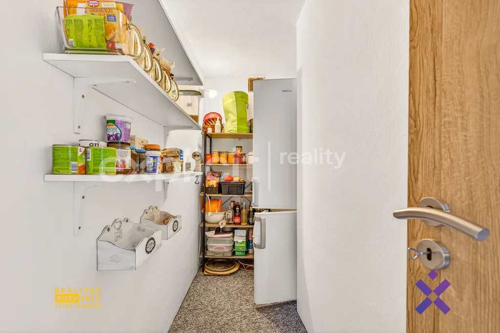 Vedle tohoto pokoje je praktická špajzka vhodná k uskladnění potravin. Hned vedle se nachází vstup do sklepa, který může budoucí majitel využít pro skladování potravin nebo sezónních věcí. Sklep je díky oknu větraný a přirozeně prosvětlený. Dům je zateplen a vybaven plastovými okny s dvojskly, o tepelný komfort se stará plynový kotel (instalace 6/2021), který je umístěn na chodbě.