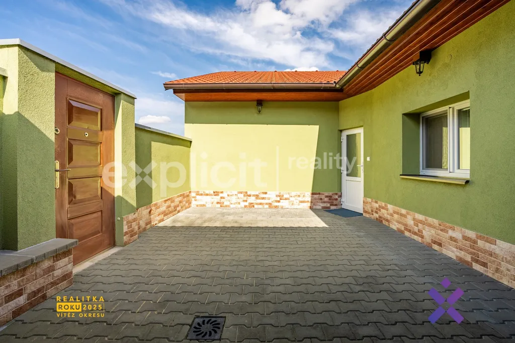 Z chodby domu se dále dostanete na dlážděný dvorek s přístřeškem, který nabízí příjemné zázemí pro posezení nebo praktické využití během celého roku. Z tohoto dvorku je následně vstup na zahradu.