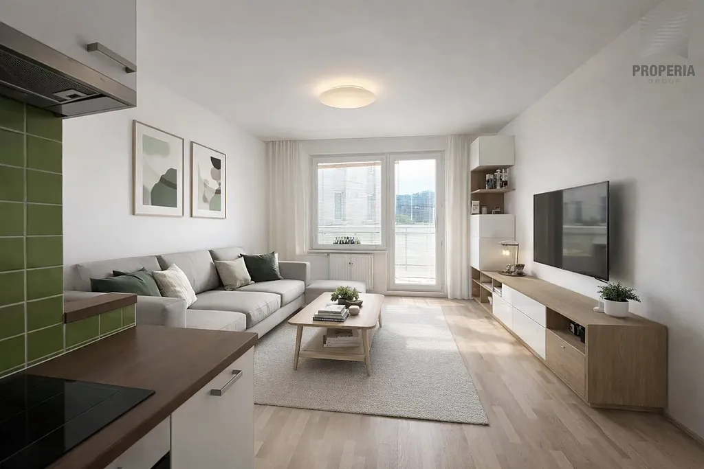 Dominantou bytu je světlý obytný prostor s novou kuchyňskou linkou vybavenou spotřebiči (lednice, myčka, trouba), která poskytuje komfortní zázemí pro každodenní bydlení. Z obývací části je vstup na zasklenou lodžii orientovanou na západ, ideální pro odpočinek či příjemné posezení při západu slunce.