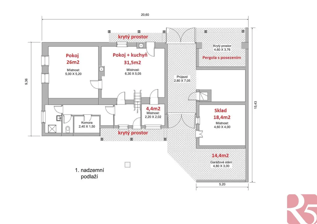 V 1 NP se nachází vstupní předsíň se vstupem do velkorysé hlavní místnosti s kuchyní a obývací částí. Odtud je možný přímý vstup do krytého venkovního posezení a zahrady. Vstup do dalšího pokoje situovaného do štítu domu a menšího pokoje směrem do dvora. Z předsíně je přístupná část s oddělenou toaletou, koupelnou se sprchovým koutem a komorou.