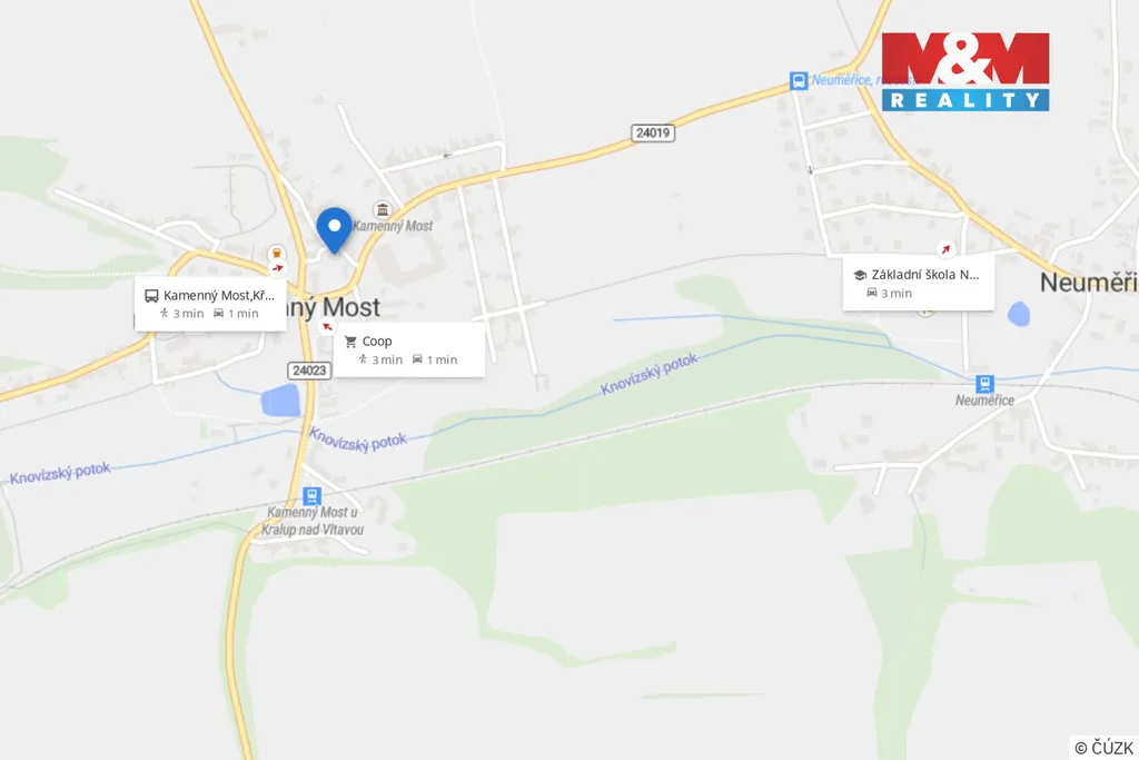 Rodinný dům v centru venkovské obce Kamenný Most vás osloví svojí polohou i potenciálem. Malá obec s náměstíčkem, hospodou a zastávkou nabízí klid každodenního života s výbornou dostupností – sjezd na dálnici je blízko a cesta autem do Prahy zabere přibližně 28–40 minut.