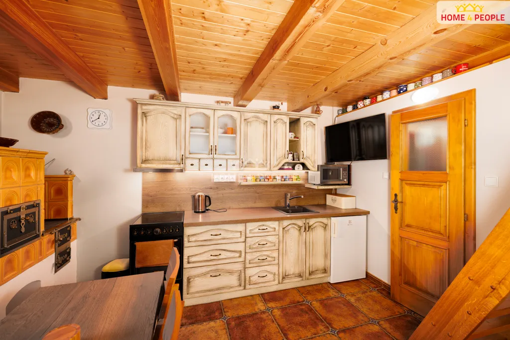 Dispozice zahrnuje koupelnu se sprchovým koutem a WC, elektrický topný žebřík, plně vybavenou kuchyňskou linku (lednice, mikrovlnná trouba, sklokeramická deska, trouba) a kachlová kamna, která slouží k vytápění i vaření. Samozřejmostí je klimatizační jednotka s funkcí chlazení i topení. V podkroví se nachází prostor pro spaní.