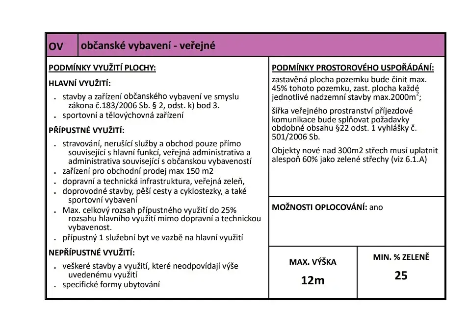 V katastru probíhá změna územního plánu a pozemek je nově veden jako plocha občanské vybavenosti.