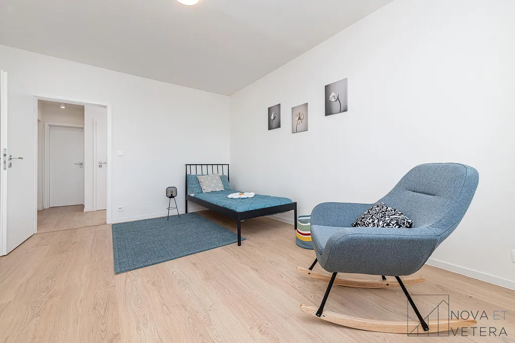 Dispozice bytu nabízí prostorný obývací pokoj s kuchyňským koutem se vstupem na balkon s výhledem do zeleně a tři samostatné pokoje, které lze využít jako ložnici, dětský pokoj či pracovnu. Dále byt disponuje koupelnou se sprchovým koutem, samostatnou toaletou, technickou místností a vstupní chodbou s dostatkem prostoru pro úložná řešení. K bytu náleží sklepní kóje o velikosti 2 m².