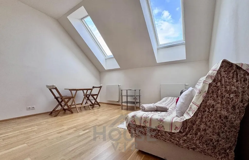 K dispozici je klimatizace, rozkládací gauč, kuchyňská linka včetně mikrovlné trouby Whirpool, lednice Electrolux, 2-plotýnková sklokeramická varná deska a digestoř. Koupelna je vybavena sprchovým koutem, toaletou a pračkou. Díky střešním oknům je byt příjemně světlý a vzdušný. Podlahy jsou plovoucí, v koupelně dlažba.