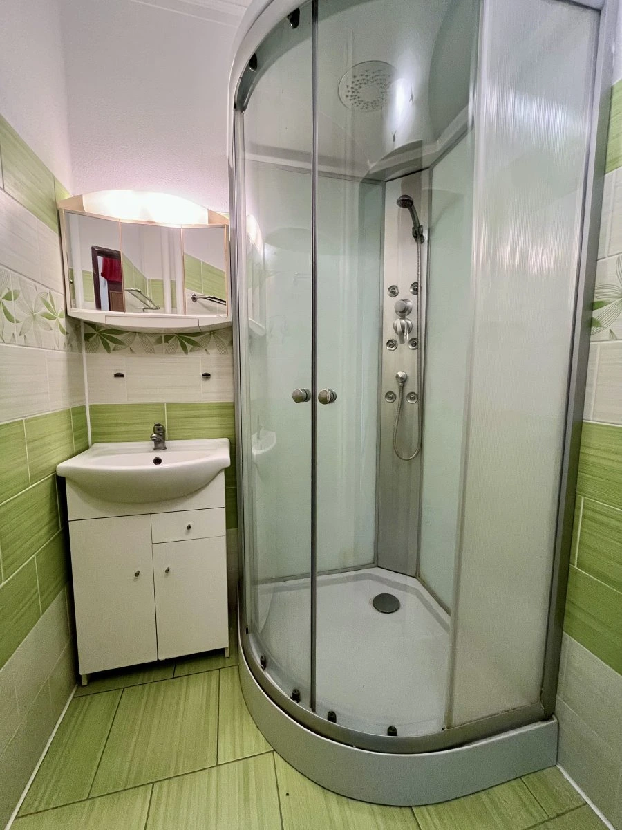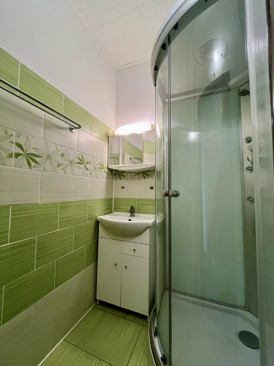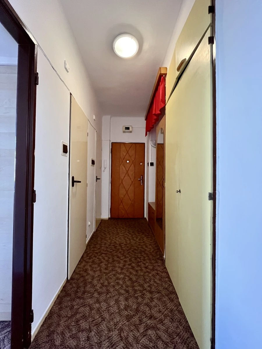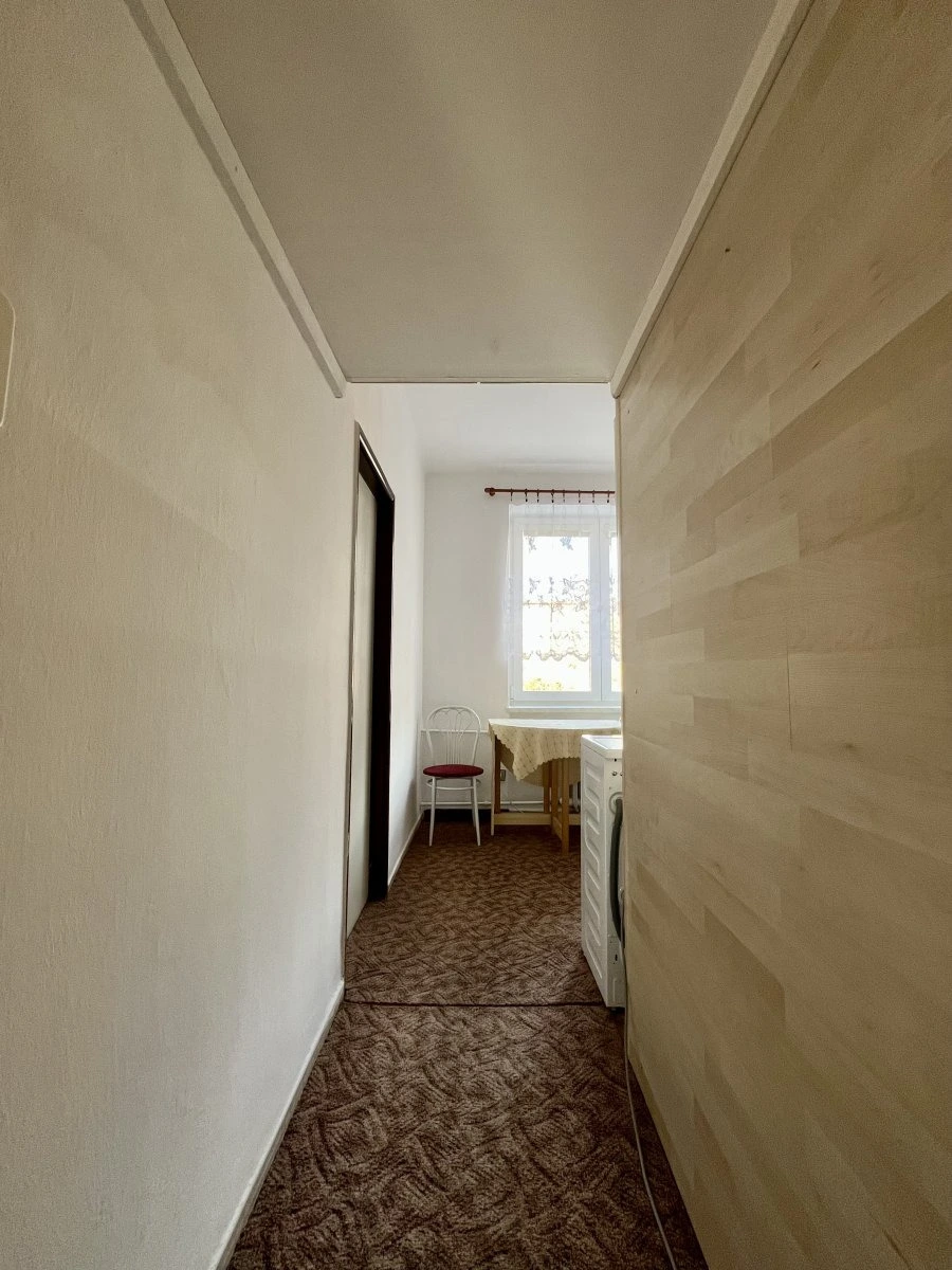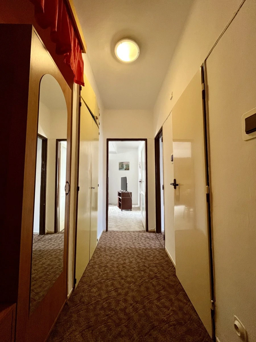 Dispozice bytu nabízí vstupní chodbu s vestavěnou šatní skříní, ze které se pohodlně dostanete do všech místností. Byt má jeden průchozí obývací pokoj a jeden samostatný neprůchozí pokoj, který poskytuje dostatek soukromí. Koupelna je vybavena sprchovým koutem, toaleta je oddělená.