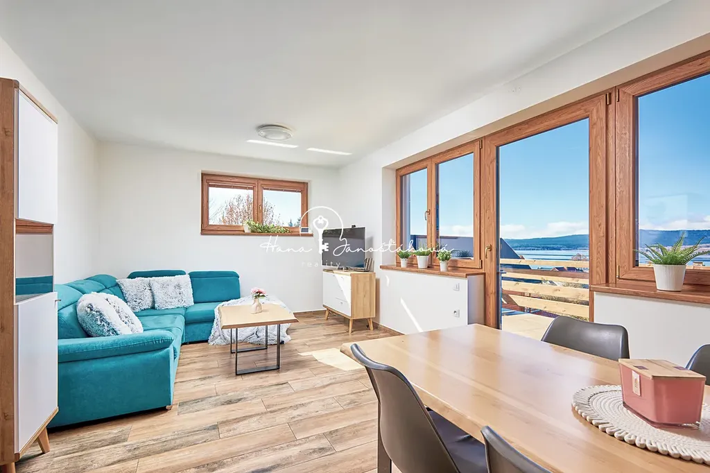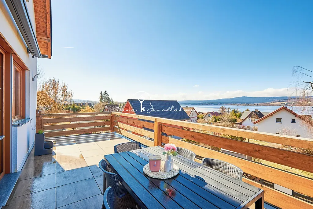 V přízemí se nachází 1+kk (ložnice, kuchyňka a koupelna s toaletou). V prvním patře najdete prostorný obývací pokoj s kuchyní a koupelnu s toaletou. Z obývacího pokoje je vstup na velkou terasu s krásným výhledem na jezero, její západní orientace nabízí nezapomenutelné západy slunce. V podkroví jsou dvě ložnice a toaleta. Na zahradě je několik parkovacích stání, nově je postaven prostorný zahradní domek. Chata je částečně podsklepená. Na oknech jsou venkovní žaluzie. Dům je vytápěn tepelným čerpadlem, voda je čerpána z vlastního vrtu.