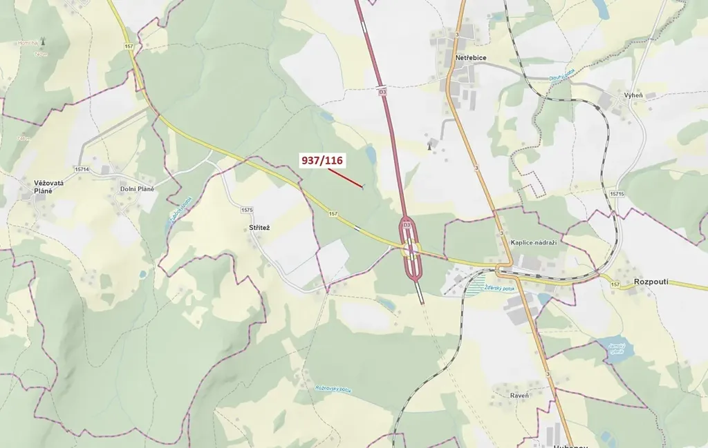 Lesní pozemek o výměře 295 m2, parcelní číslo 937/116, podíl 1/1, katastrální území Netřebice, obec Netřebice, obec s rozšířenou působností Kaplice, okres Český Krumlov, Jihočeský kraj.