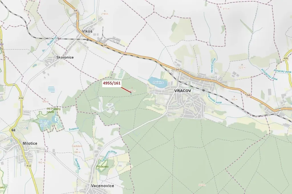 Lesní pozemek o výměře 1702 m2, parcelní číslo 4955/161, podíl 1/1, katastrální území Vracov, obec Vracov, obec s rozšířenou působností Kyjov, okres Hodonín, Jihomoravský kraj.