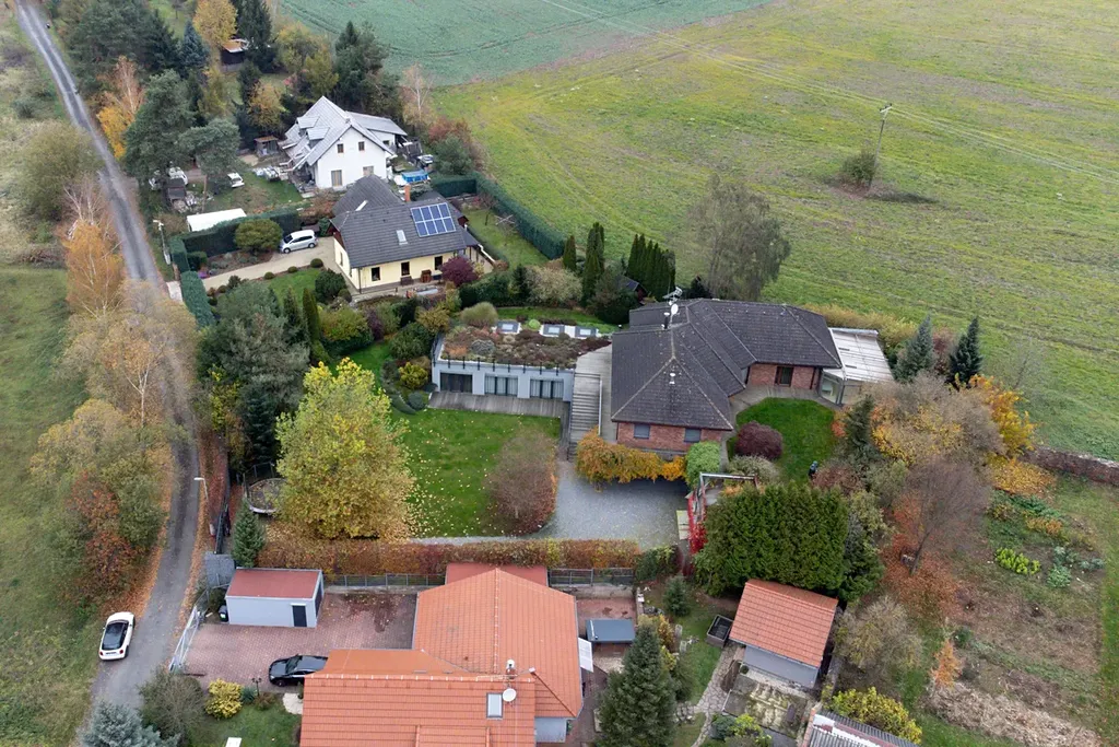 Tento rodinný dům se 7 pokoji a kuchyňským koutem nabízí komfortní a prostorné bydlení v klidné vesnici obklopené lesy, což zajišťuje soukromí a příjemné prostředí. S jihozápadní orientací a efektivním využitím svažitého terénu je interiér příjemně prosvětlený a zahrada o rozloze 1585 m² s vrostlou zelenou vegetací, poskytuje dostatek prostoru pro různé aktivity a relaxaci. Dům byl přestavěn z původní budovy a v roce 2012 byla přistavěna nová část s vegetační střechou.