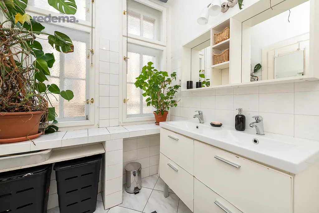 Zázemí bytu tvoří prostorná koupelna s vanou a bidetem (~ 10 m²), samostatná toaleta naproti a reprezentativní vstupní chodba (téměř 10m dlouhá a 1,5m široká), která podtrhuje velkorysý charakter celého interiéru. Byt tak nabídne komfort a pohodlí všem obyvatelům bez ohledu na denní dobu.