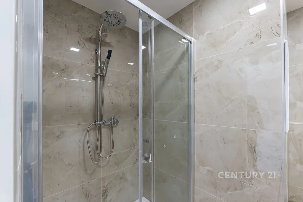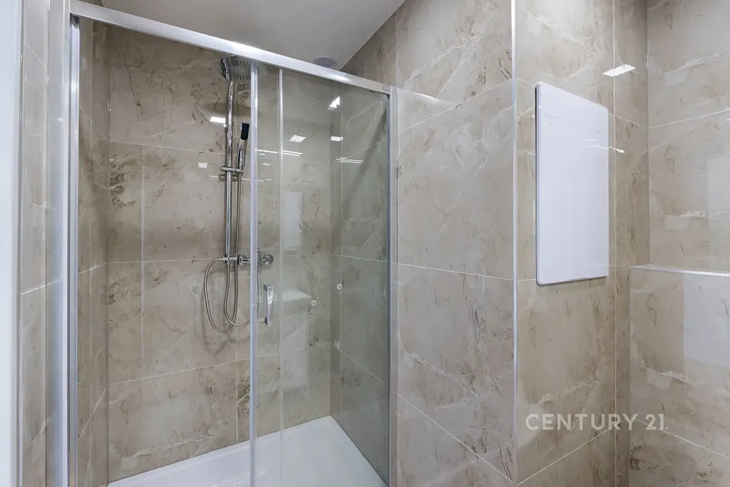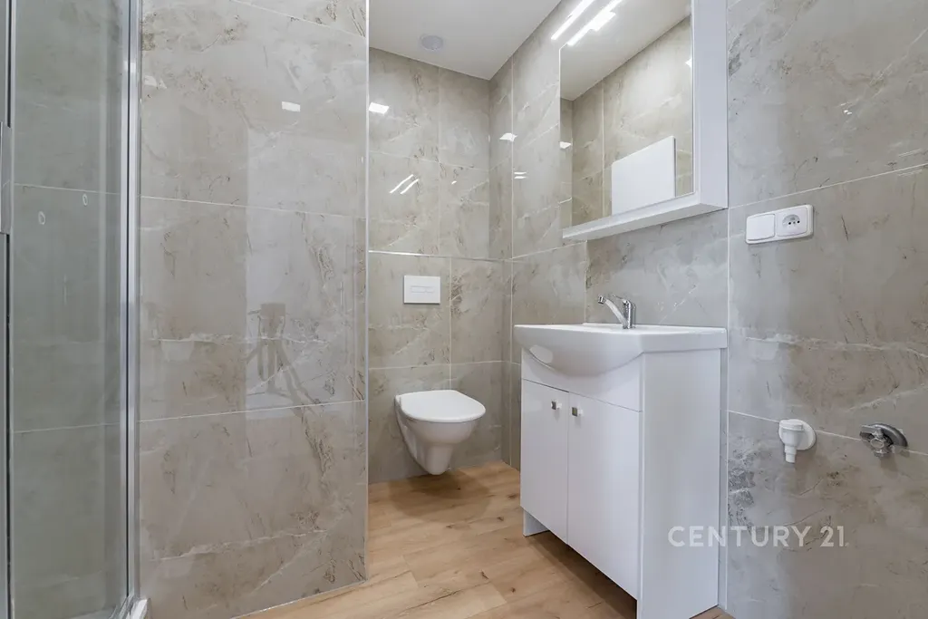 • Stylová koupelna se sprchovým koutem, velkoformátovými obklady, novým sanitárním vybavením, skříňkou pod umyvadlo a WC