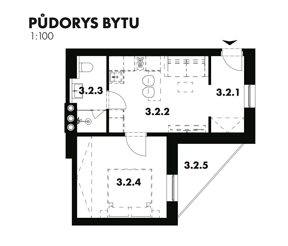 Rozpis místností: Pokoj 12,26m2, WC 0,95m2, Koupelna 2,87 m2, Obývací pokoj + kuchyně 13,57 m2, Předsíň 3,43 m2