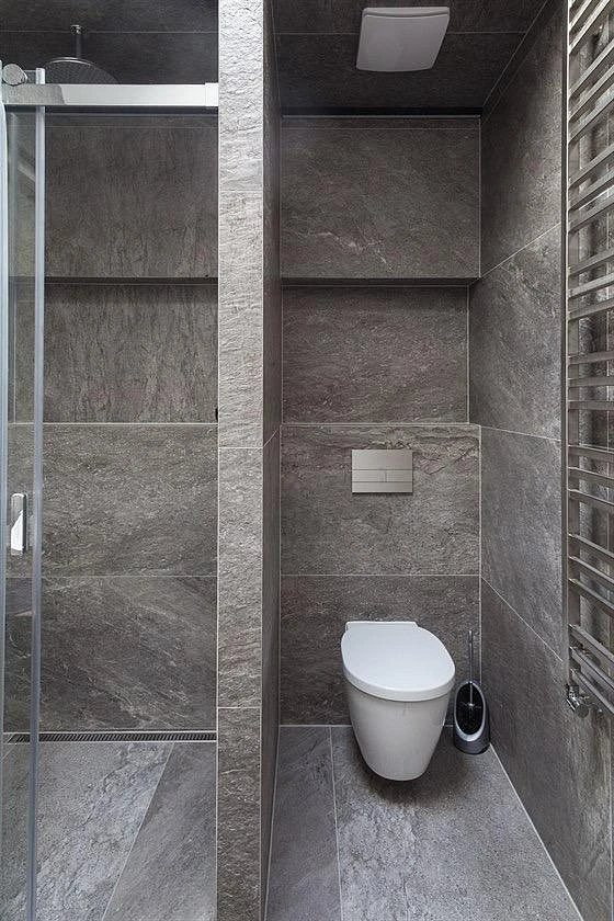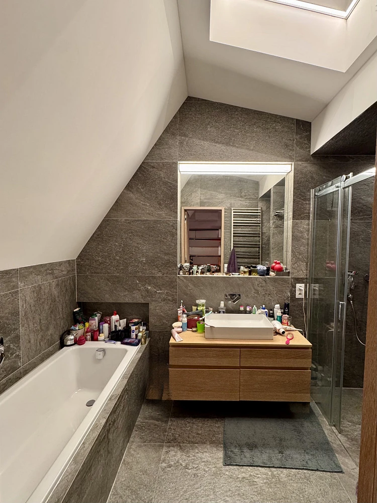 Za dveřmi integrovanými v dřevěné stěně je koupelna s tmavým kamenným obkladem a dalším světlíkem, toaletou, vanou a sprchovým koutem.